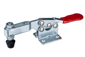 Horizontal acting toggles clamps make it possible to realize high vertical clamping forces at the clamping point by expending only small amounts of manual input forces at the handle. Handle and Clamping arm move in the opposite direction. In the clamped position the handle is in horizontal position. One of the most important advantage of horizontal acting clamps is having a low profile in clamping position. They are very suitable for applications having low height space.